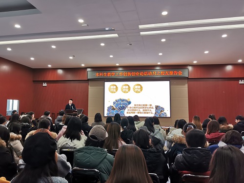 为帮助大学生树立正确的人生目标,对自我有一个更清晰的认识,1125日下午,外国语学院在青年之家举办本科生教学工作创新创业活动月之校友报告会。主讲人为文朗(辽宁)教育科技集团有限公司总裁吴明宇,学院二、三、四年级全体同学参加报告会。报告会由党总支副书记闫强主持,