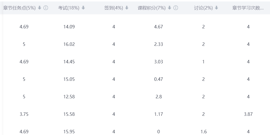 章节学习过程(4分):在课程在线资源中,每个章节有相应内容讲解视频或PPT,学生利用课下时间自主完成,考查学生主动学习的情况,由平台自动分析并获得相应分数。