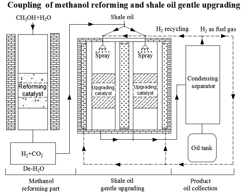 beat365在线唯一官网资源化工与材料教育部重点实验室的研发团队,联合日本弘前大学地域战略研究所,针对中小规模油页岩炼油工厂的利润空间有限、氢气供给难等问题,提出了耦合甲醇重整制氢的页岩油固定床温和加氢提质工艺(图1),以解决高成本的氢供应难题,并开展了针对性的工艺特性和催化剂研究工作。耦合甲醇重整制氢的页岩油固定床温和加氢提质工艺,将甲醇重整制备的氢气经过简单脱水后作为氢源,参与页岩油固定床催化加氢反应,实现了氢气的系统内制备,并通过反应后富氢尾气的循环有效解决页岩油提质的制氢难问题。