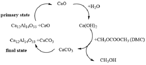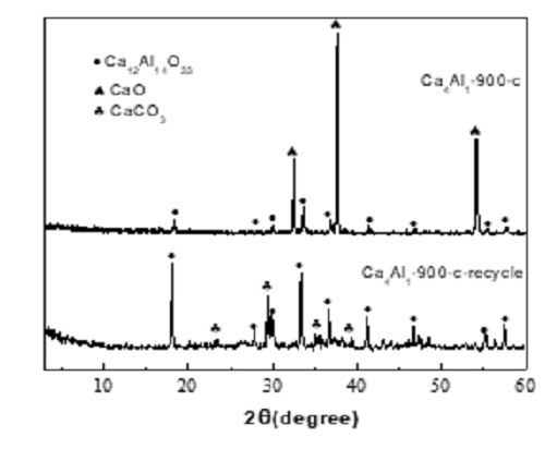 为了进一步揭示失活机理,探索催化剂中稳定的催化成分,对回收的催化剂进行了XRD分析,结果如图3所示。与未反应的新鲜催化剂相比,回收的催化剂仍然具有钙铝石相,但CaO相完全消失并被CaCO3相取代。在图2中,从2800到4000分钟的催化活性组分仅为钙铝石相。结合稳定性评价实验结果(图 2)和 XRD 图谱(图 3)可以推断,在反应过程中,催化剂中的CaO逐渐转变为惰性的CaCO3,导致催化剂活性急剧下降。钙铝石稳定,在整个4000分钟催化过程中保持不变。