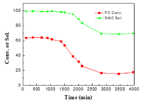 催化剂稳定性结果如图2所示。在反应初始阶段(0-900 min),催化剂保持稳定的 PC 转化率为 63%,为该反应条件下的平衡转化率,DMC 选择性保持在 100%。随着反应的继续(900-2800 min),催化剂开始出现明显的失活,PC转化率从63%迅速下降到16%,DMC选择性也从100%下降到70%。但随着反应时间的进一步延长(2800-4000 min),催化剂的活性保持稳定,PC转化率和DMC选择性分别保持在16%和70%左右,没有观察到进一步的失活.这些结果表明,催化活性组分在2800-4000分钟的工作时间具有良好的稳定性。