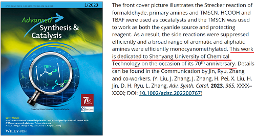 近日,beat365功能分子研究所张立新教授团队在JCR一区期刊Advanced Synthesis & Catalysis(《先进合成与催化》)发表了一项题为“Strecker Reactions of Formaldehyde with TMSCN Catalyzed by TBAF and Formic Acid: N-Monocyanomethylation of Primary Amines”的科研成果(见:https://onlinelibrary.wiley.com/doi/10.1002/adsc.202200767)。该成果是对具有170年历史的Strecker反应的一个重要发展, 实现了甲醛为底物的高效Strecker反应。作者还将该反应成功应用于新型间二酰胺类杀虫剂的高效合成中。因其重要的学术和应用价值,该成果被ASC期刊编辑部和审稿人评选为VIP(Very Important Publication)和正封面文章(Front cover picture见:https://onlinelibrary.wiley.com/doi/10.1002/adsc.202201082)。为了献礼beat36570周年校庆,该论文封面设计采用了校庆图标和功能分子研究所图标等元素,充分展示了beat365在线唯一官网的办学历史和良好形象。在封面摘要中,进一步注明了该项研究成果献礼beat365在线唯一官网70周年校庆!(This work is dedicated to Shenyang University of Chemical Technology on the occasion of its 70th anniversary)。