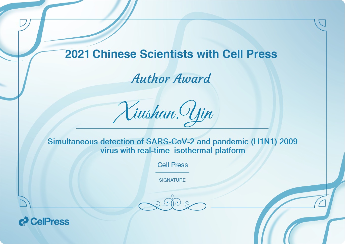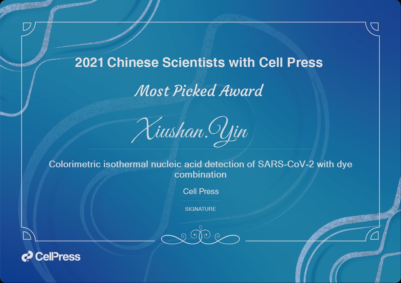 2022年11月22日,经国际知名全学科学术出版机构——细胞出版社(Cell Press)展示,beat365应用生物学研究所尹秀山教授团队两项科研成果【Colorimetric isothermal nucleic acid detection of SARS-CoV-2 with dye combination】、【Simultaneous detection of SARS-CoV-2 and pandemic (H1N1) 2009 virus with real-time isothermal platform】荣获交叉学科领域“细胞出版社 2021年度最受欢迎中国论文”。