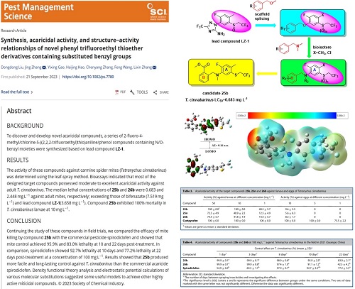 近日,农林科学领域国际权威期刊《Pest Management Science》(中国科学院1区Top, IF = 4.1)在线发表了沈阳化工大学功能分子研究所张立新教授团队的研究论文“Synthesis, acaricidal activity, and structure–activity relationships of novel phenyl trifluoroethyl thioether derivatives containing substituted benzyl groups”(https://doi.org/10.1002/ps.7780),beat3652020级联合培养博士研究生刘东东为第一作者,功能分子研究所张静高级工程师和张立新教授为共同通讯作者。