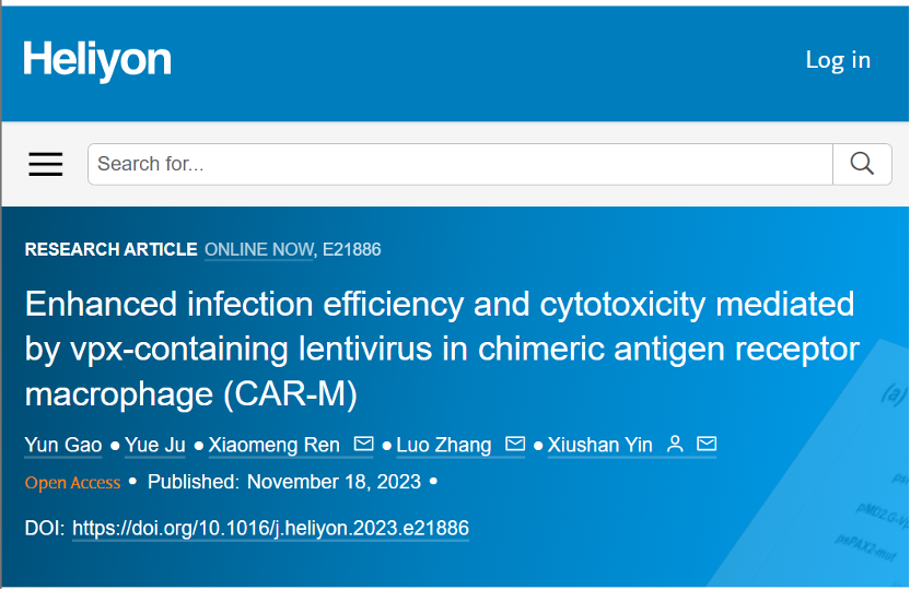 2023年11月18日,尹秀山教授团队联手鲲石生物、解放军总医院,又一最新研究成果“Enhanced infection efficiency and cytotoxicity mediated by vpx-containing lentivirus in chimeric antigen receptor macrophage (CAR-M)”于Cell旗下杂志《Heliyon》发表。