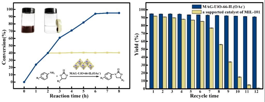 该项成果以题为“A magnetic pore-confined catalyst with ionic liquids supported on MOFs for the synthesis of aryl-oxazolidinones: design, performance, and recyclability”发表在化工领域知名期刊Chemical Engineering Journal (中国科学院一区,IF=15.1),beat365在线唯一官网种思颖、李佼妍为本研究第一作者,王康军教授、张雅静教授和中国科学院青海盐湖研究所柳瑞瑞为通讯作者,赵爽、黄刚伟参与研究。