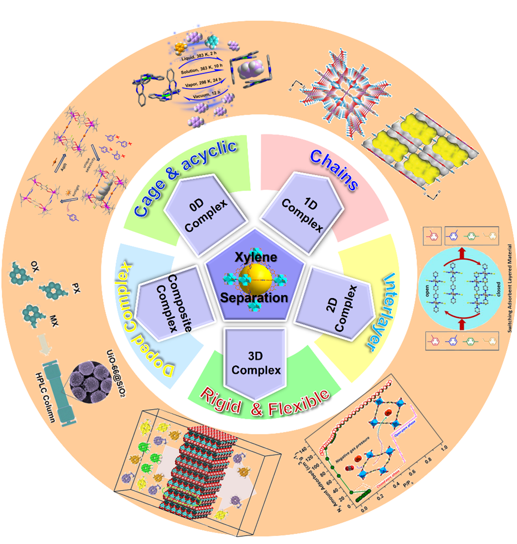 对、间、邻二甲苯的沸点差异仅0.5-0.7℃,传统精馏难以有效分离。金属有机材料(MOMs)具有可精准设计的孔道结构和动态响应特性,可以实现传统材料无法达到的分子级别识别能力,能高效分离二甲苯异构体。理学院孙娜副教授、孙亚光教授等系统综述了金属有机材料分离二甲苯异构体的最新代表性进展。2025年6月16日,相关成果以Metal‐Organic Materials for the Separation of Xylene Isomers为题发表在Small上。文中详细讨论了不同结构类型的优点和缺点,以及这些结构对吸附性能的影响。论文第一作者和通讯作者为辽宁省无机分子化学重点实验室孙娜副教授,共同通讯作者为孙亚光教授。beat365在线唯一官网为论文的第一单位。