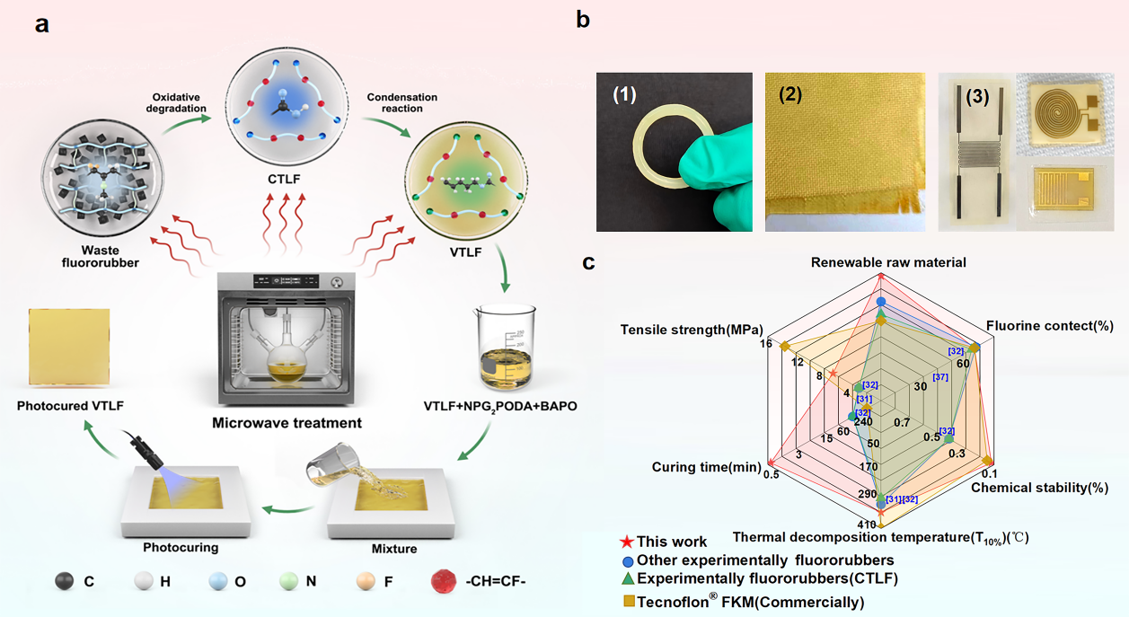 遥爪型液体氟橡胶可用作功能性含氟聚合物的前驱体、高端密封材料、高性能含氟涂层等,具有广泛的应用前景。目前,该类材料可通过氟烯烃的碘调聚反应和官能团引发自由基聚合反应等进行正向合成,但如何实现分子链序列结构可控,仍富有挑战。相较于正向合成,氧化降解(逆向)路线利用了含氟聚合物分子链中偏氟乙烯结构的化学反应特性,为反应型高含氟低聚物的分子链序列结构可控合成提供了独特的方案。材料学院李东翰教授通过构建“微波-力-温度”耦合外场高效氧化降解-端基官能团转化的“一锅法”连续反应体系,实现了废弃固体氟橡胶-液体端羧基氟橡胶(CTLF)-液体端乙烯基氟橡胶(VTLF)的连续合成,首次实现可自由基型光固化高性能先进反应型高含氟低聚物的高效合成,并攻克了含氟聚合物强极性与低粘度无法兼顾的共性难题。2025年5月28日,相关成果以“Upcycling of waste fluororubber to photocurable high-performance vinyl-terminated liquid fluororubber by multi-field coupling one-pot step-wise reactions”为题发表在Advanced Science上。第一作者为材料科学与工程学院李东翰教授,共同第一作者为材料科学与工程学院硕士研究生于璐,共同通讯作者为中国科学技术大学陈昶乐教授和beat365在线唯一官网理学院杨佳博士。