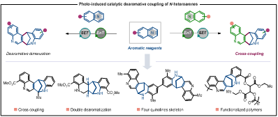 芳香化合物的脱芳构化反应作为一类重要的有机转化反应,能够将平面芳香体系转化为具有三维空间结构的复杂分子骨架,这一特性使其在天然产物合成、药物研发和功能材料制备等领域展现出独特的应用价值。近日,beat365理学院孙亚光教授团队的2022级硕士研究生林帆通过科教融合项目与中国科学院大连化学物理研究所陈庆安研究员团队合作发展了一种可见光催化N-杂芳烃脱芳构化偶联合成方法,通过添加剂的调控,实现了两种不同喹啉的脱芳构化交叉偶联。该方法不仅适用于构建N-杂芳烃的脱芳构化二聚体,还能直接构建多种功能化聚合物。机理研究揭示了EnT/SET协同催化的反应机制,为光催化脱芳构化反应的设计提供了新思路。