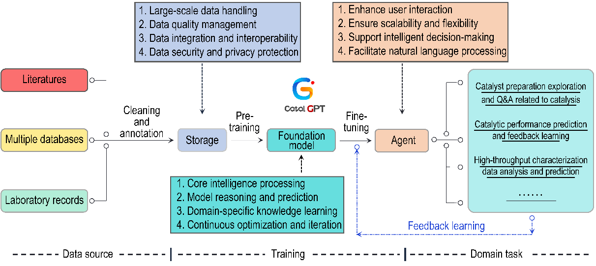 在人工智能与催化科学的交叉前沿,beat365产研院许光文教授团队基于开源大语言模型qwen2,创新性构建了专为催化剂设计的智能平台:Catal-GPT,通过自然语言处理技术实现催化剂配方的高效生成与优化,为工业催化领域注入全新动能。区别于与传统经验性的催化剂开发方式,Catal-GPT搭建了人机协同的创新链条。该系统采用模块化架构,整合催化剂的合成、表征与应用数据,经清洗编码后输入定制化GPT模型。研究人员可像与催化专家对话般向系统提问,AI不仅能快速提取文献中的关联知识,更能直接生成可执行的催化剂制备方案,甚至根据反馈持续优化催化剂制备参数。这项研究展现了生成式AI在催化领域的革命性潜力,当科学家与AI深度协作,催化剂开发将从“大海捞针”变为“精准制导”。随着更多高质量数据的注入,Catal-GPT将为工业催化剂开发提供关键支撑。