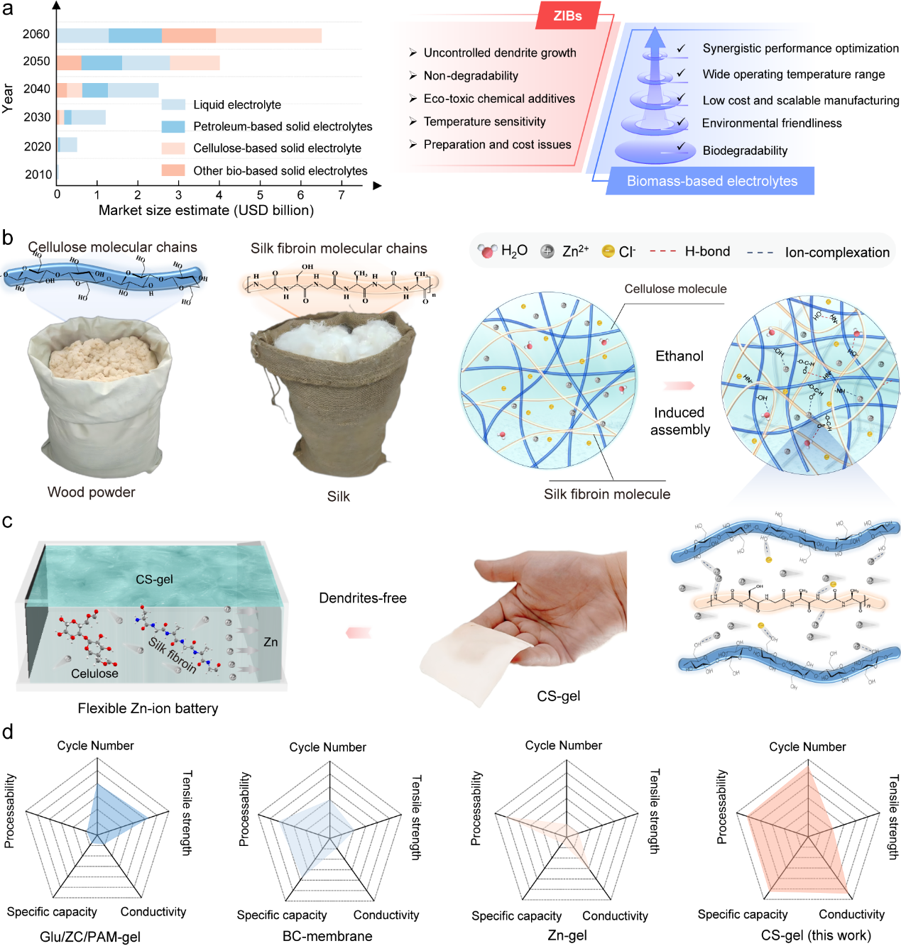 纤维素与丝素蛋白作为天然生物聚合物,分别来源于木材、竹材和蚕丝等可再生资源,具有优异的生物相容性、可降解性和丰富的官能团结构。随着柔性电子和可持续能源存储需求的日益增长,开发兼具高机械强度与优异离子电导率的生物基凝胶电解质,已成为能源材料领域的前沿热点。