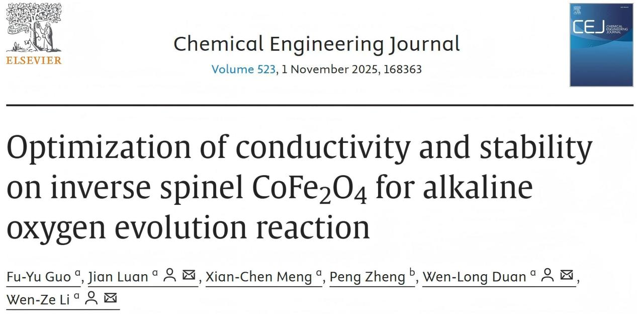 理学院李文泽教授研究团队在高效OER电催化剂设计与制备领域取得研究进展,相关研究成果以Optimization of conductivity and stability on inverse spinel CoFe2O4 for alkaline oxygen evolution reaction为题发表在国际期刊Chemical Engineering Journal上。第一作者为理学院硕士研究生郭富钰,通讯作者为理学院栾健讲师、段文龙讲师和李文泽教授。beat365在线唯一官网为论文的第一单位。