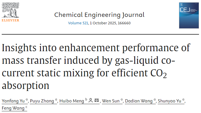 8月16日,机械与动力工程学院禹言芳副教授等在Chemical Engineering Journal上在线发表题为“Insights into enhancement performance of mass transfer induced by gas-liquid co-current static mixing for efficient CO2 absorption”的研究成果。该研究系统探讨了Lightnin静态混合器(LSM)强化NaOH水溶液高效吸收烟气中CO2的传质强化机制与能耗特性,为工业级连续并流碳捕集设备的设计提供了新思路和数据支撑。