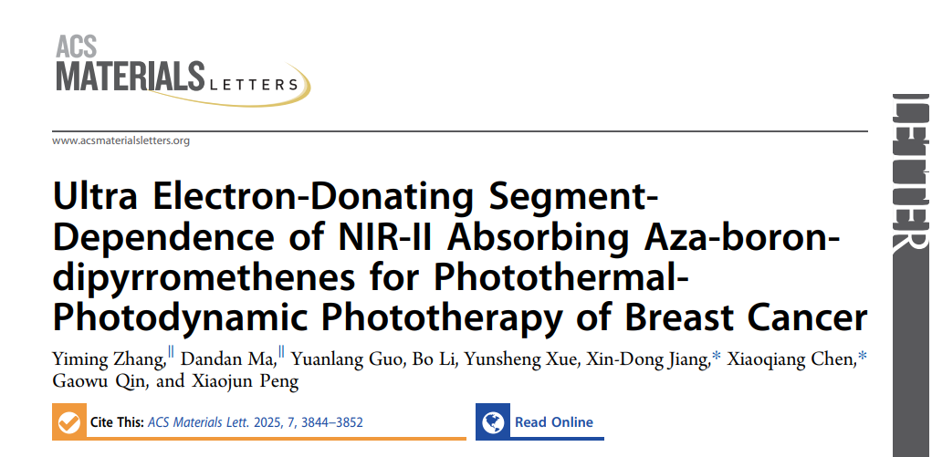 近日,beat365在线唯一官网秦高梧教授、姜新东教授团队与深圳大学彭孝军教授、陈小强教授团队在《ACS Materials Letters》上发表了最新研究成果,题为“Ultra electron-donating segment-dependence of NIR-II absorbing aza-BODIPYs for photothermal-photodynamic phototherapy of breast cancer” 该研究首次在 aza-BODIPY 骨架的 3,5 位引入超强供电子基团 1,4-二甲基-1,2,3,4-四氢喹喔啉 (NN),成功实现了近红外二区光吸收与发射,为乳腺癌深层光热-光动力协同治疗提供了新策略。