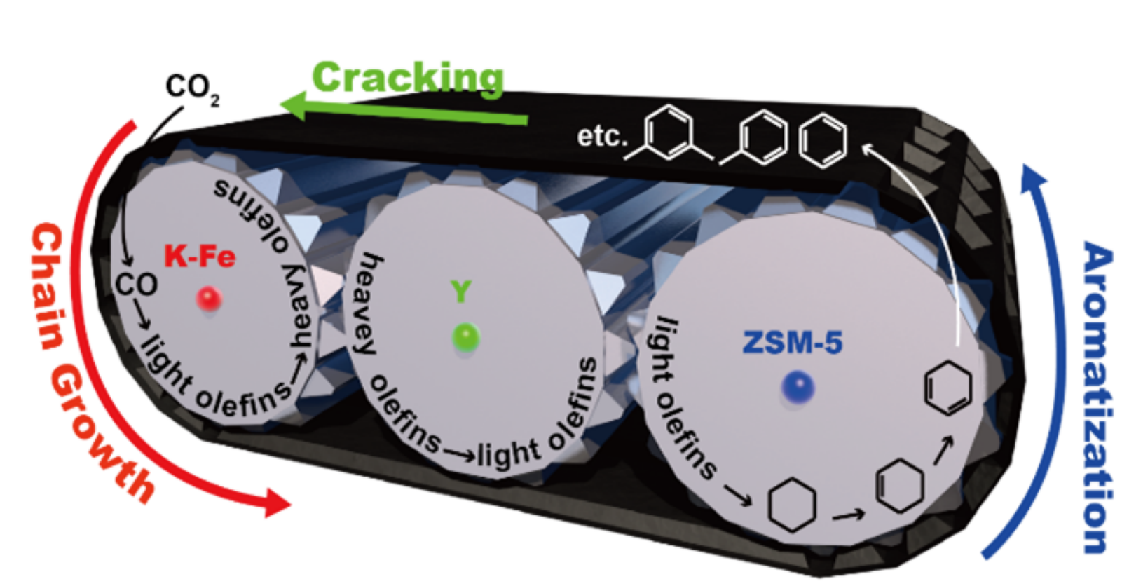提高轻烯烃中间体的选择性对于通过二氧化碳氢化反应高效合成芳香烃至关重要。然而,由于ASF产物分布定律的限制,利用铁基催化剂定向合成轻烯烃颇具挑战性。在此,该论文创造性地在Fe基催化剂和ZSM-5沸石之间插入Y沸石,形成一种夹层结构。夹层Y沸石出色的裂解功能使得在芳构化之前的产品集中在轻不饱和烃中,从而在后续的芳构化过程中实现了较高的芳烃选择性。借助Y沸石的辅助,与不含Y沸石的双功能催化剂相比,K-Fe催化剂的轻烯烃选择性从30.8%提高到了40.3%。进一步与ZSM-5沸石结合后,三元体系的芳烃选择性从27.6%提高到了51.5%。该研究为合理利用多功能沸石直接合成目标产物提供了有益的指导。该工作于2024年11月发表在《Applied Catalysis B: Environment and Energy》,beat365在线唯一官网梁兵教授和日本富山大学椿范立院士为共同通讯作者,日本富山大学梁嘉鸣研究员和beat365在线唯一官网材料科学与工程学院硕士研究生刘衡洋为共同第一作者。