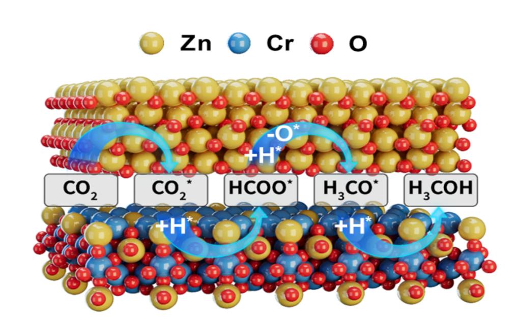 理解氧空位的影响对于揭示分子吸附以及合理设计催化剂具有重要意义。理解氧空位的影响对于揭示分子吸附现象以及合理设计催化剂具有重要意义。然而,对于具有多种相的催化剂而言,氧空位在不同活性位点上的性质及其内在催化机制尚未得到充分研究。然而,对于具有多种活性相的催化剂而言,氧空位在不同活性位点上的性质及其内在催化机制尚未得到充分研究。在此,该论文通过共沉淀法来合成具有不同活性相氧空位分布和含量的Zn-Cr催化剂,用于二氧化碳加氢反应。通过表征和密度泛函理论计算(DFT)表明,尽管与尖晶石或金属氧化物相相比,氧空位在ZnO和ZnCr2O4之间的相邻界面上生成的可能性较低,但ZnO/ZnCr2O4−Ov处的界面氧空位位点降低了甲醇合成过程中关键中间体HCOO*和H3CO*的形成能垒,从而促进了甲醇合成。因此,借助均匀分散的界面氧空位,3Zn1Cr催化剂在所有比例的Zn-Cr催化剂中表现出最高的甲醇选择性(80.5%)以及最高的二氧化碳转化率(19.2%)。同时,进一步将 3Zn1Cr 与改性β沸石结合后,复合催化剂显示出优越的液化石油气选择性。在二氧化碳转化率为30.2%的情况下,LPG的选择性达到了84.0%。该论文提出的策略为通过甲醇介导的途径设计高效的复合催化剂,以实现C1化学反应提供了新的思路。该工作于2025年4月发表在《ACS Catalysis》上,beat365在线唯一官网梁兵教授和日本富山大学椿范立院士为共同通讯作者,日本富山大学梁嘉鸣研究员和beat365在线唯一官网材料科学与工程学院硕士研究生姜蕾为共同第一作者。