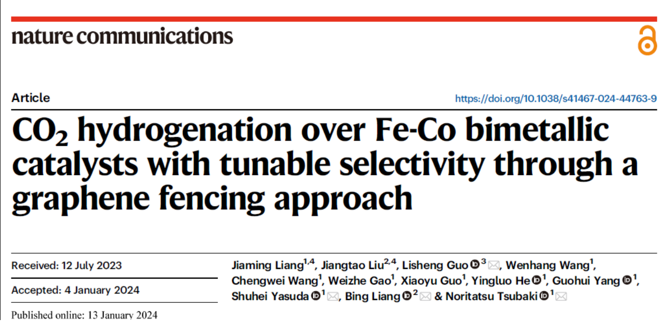 调整二氧化碳加氢产物的分布以获得高选择性的目标产物具有重要意义。然而,由于链增长和加氢反应的调控不够精确,定向合成单一产物颇具挑战性。然而,由于链增长和加氢反应的调控不够精确,定向合成单一产物颇具挑战性。在此,该论文报告了一种通过石墨烯栅栏工程控制多个活性位点的方法,该方法能够将CO2/H2混合物直接转化为不同类型的烃类。石墨烯栅栏表面的Fe-Co活性位点具有具有50.1%的低碳烯烃(C2-C4=)选择性,而由石墨烯栅栏分隔开的空位Fe-Co纳米粒子可生成43.6%的液化石油气(LPG)。借助石墨烯栅栏的辅助,铁碳化物和金属钴能够有效地调节C-C键增长和烯烃二次加氢反应,从而实现低碳烯烃和液化石油气之间的产物选择性切换。此外,该工作还开创了通过费托路线将二氧化碳直接加氢转化为液化石油气的先例,其时空产率远高于其他已报道的复合催化剂。该工作于2024年1月发表在《Nature Communications》上,beat365在线唯一官网梁兵教授和日本富山大学椿范立院士为共同通讯作者,日本富山大学博士研究生梁嘉鸣和beat365在线唯一官网材料科学与工程学院硕士研究生刘江涛为共同第一作者。