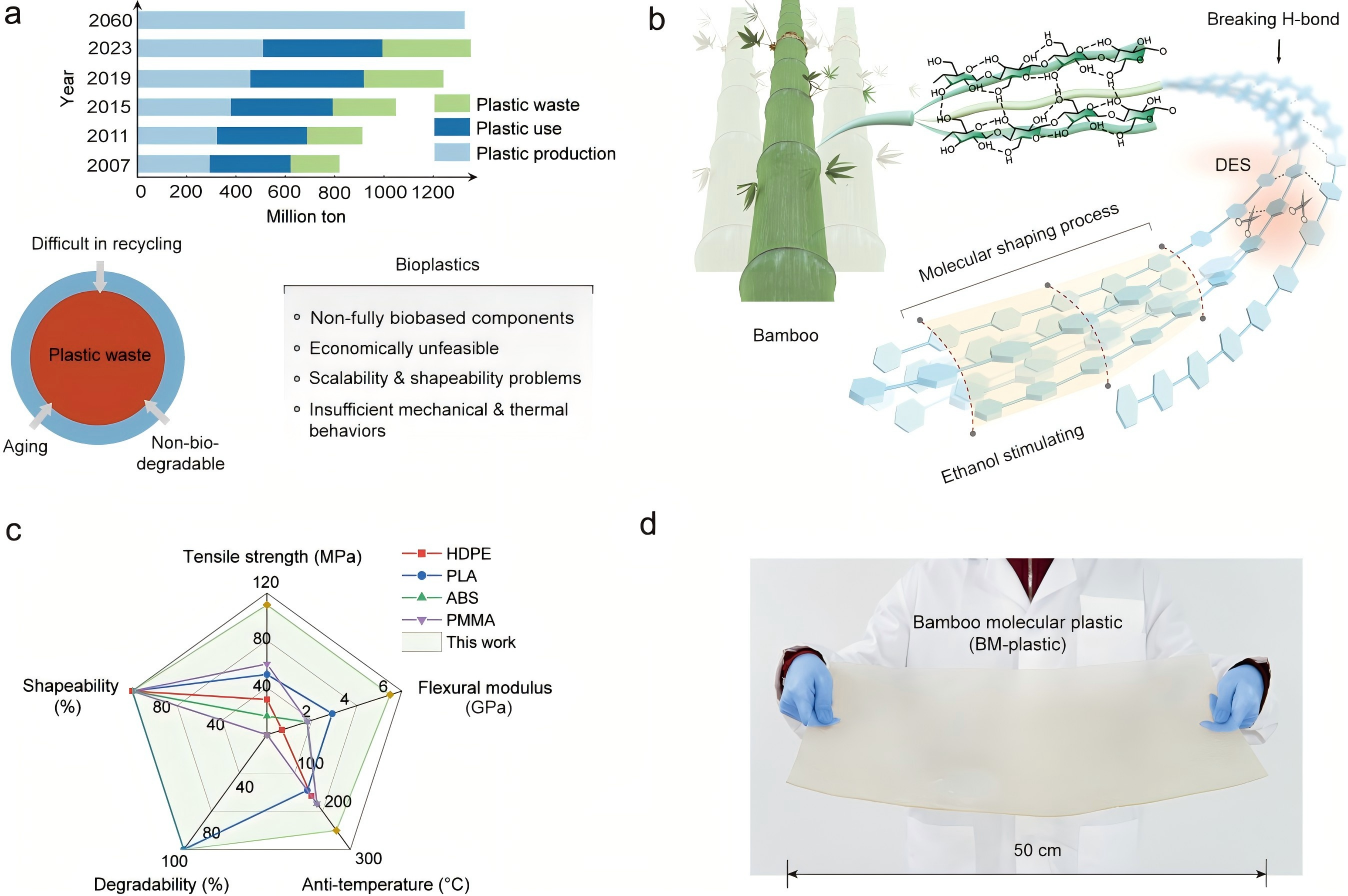 全球每年超亿吨的塑料产量与日益严峻的白色污染影响下,开发兼具高性能、可塑性、全降解及可循环再利用的生物基塑料是解决当下石化塑料污染物问题的有效途径。天然竹纤维具有高度结晶的多级结构,其分子链间致密的氢键网络赋予了纤维高的机械刚度,但也导致了本征脆性和难以加工的问题。传统物理或化学改性方法难以在破坏其刚性网络的同时,重建出有序氢键网络结构,突围以上的困境。
