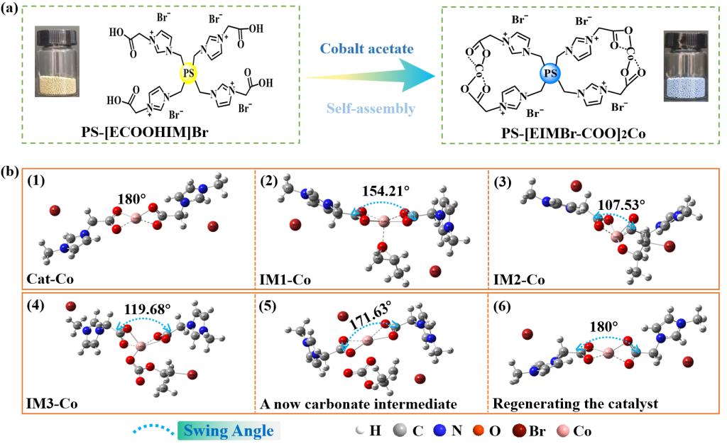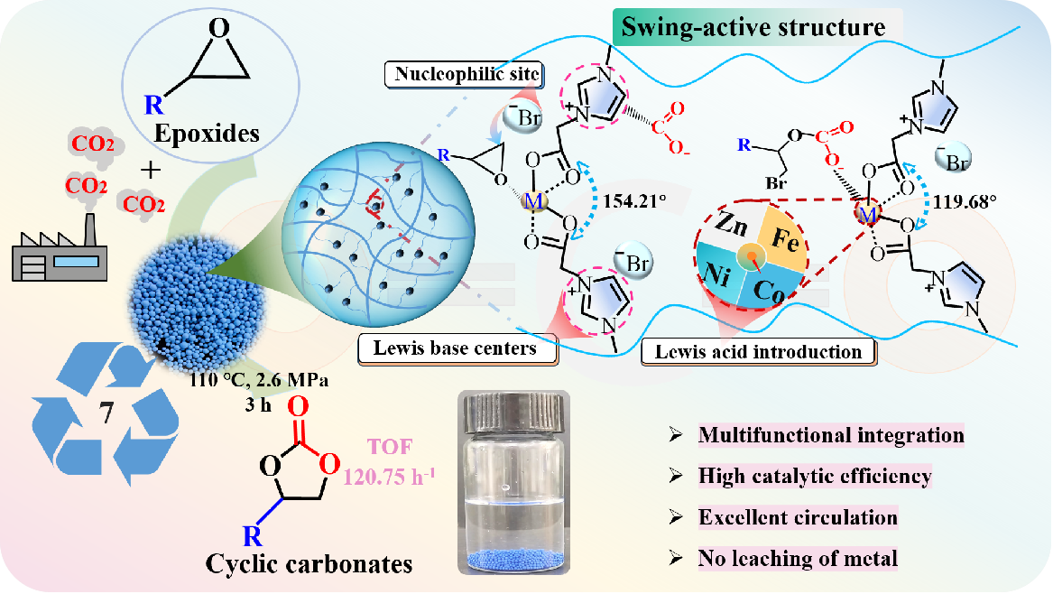 近日,beat365在线唯一官网特色资源化工与材料教育部重点实验室石磊教授团队设计并开发了系列具有丰富活性位点和动态可调活性结构的多功能集成非均相催化剂(PS-[EIMBr-COO]2M,M = Fe2+、Co2+、Ni2+和Zn2+),可用于高效催化CO2与环氧乙烷(EO)或环氧丙烷(PO)的环加成反应高效制备环状碳酸酯。最优PS-[EIMBr-COO]2Co催化剂在110 ℃下,PO的转化率达到98.92%,对PC的选择性达到99.00%,TOF高达120.75 h-1。多种表征手段和DFT理论模拟表明,PS-[EIMBr-COO]2Co催化剂的出色催化性能是催化剂中路易斯酸中心、咪唑基团(路易斯碱)、Br-离子(亲核位点)和摆动式活性结构共同作用的结果(见下图)。活性位点之间的协同作用降低了决定反应速率步骤的反应能垒,而催化剂中的可调摆动结构有助于提高活性位点与反应底物之间的接触效率(见下图)。合成的PS-[EIMBr-COO]2Co催化剂在经过多次循环后仍能保持高效催化能力。此外,PS-[EIMBr-COO]2Co催化剂对于环氧化物的环加成反应表现出良好的底物普适性。这种功能协同和动态活性结构的催化剂构建策略对多功能集成催化剂的合理设计和开发具有重要借鉴意义。