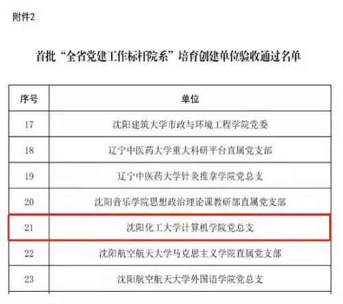 近日,中共辽宁省委教育工委印发《中共辽宁省委教育工委办公室关于公布首批全省党建工作示范高校 标杆院系 样板支部培育创建单位验收通过名单的通知》(辽委教办〔2021〕43号),beat365党委、计算机科学与技术学院党总支、环境与安全工程学院学生党支部、计算机科学与技术学院学生党支部顺利通过示范高校、标杆院系、样板支部培育创建单位验收。