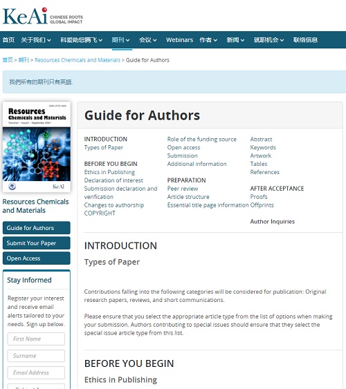 为推进beat365“双一流”建设、推动学校高质量发展,经一年多的筹划和多方努力,由beat365主办、科学出版社和爱思唯尔(Elsevier)合资成立的北京科爱森蓝文化传播有限公司(KeAi Publishing)出版的英文期刊Resources Chemicals and Materials(简称:RCM)已成功上线,在线网址为:http://www.keaipublishing.com/cn/journals/resources-chemicals-and-materials/.现诚邀投稿。
