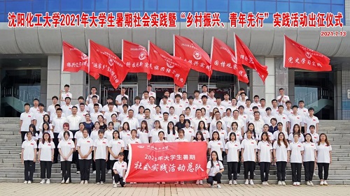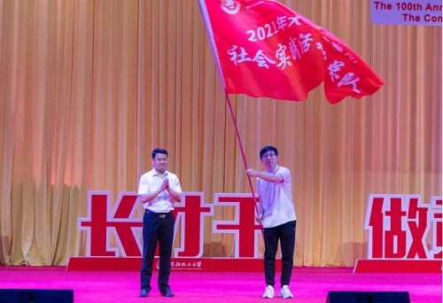 乡村振兴实践专项、机械与动力工程学院本科生吴沚阳带领现场参与社会实践活动师生集体宣誓。出席活动党政部门负责人为2021年大学生暑期社会实践活动的八个实践专项团队授旗。