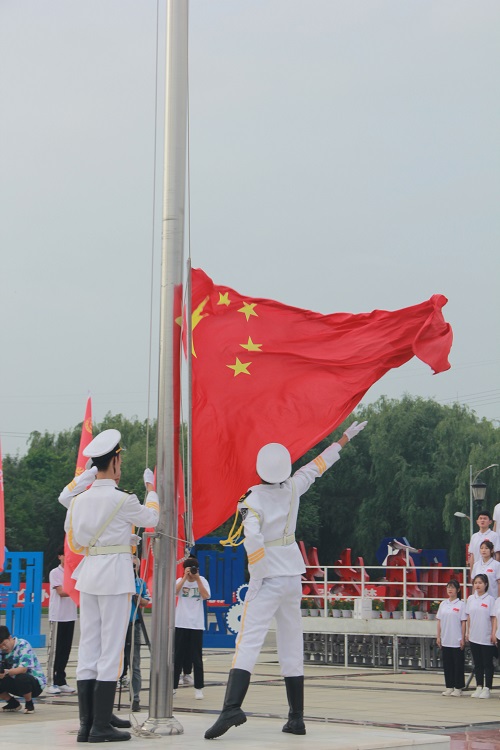 升旗仪式开始,伴随着雄壮的《义勇军进行曲》,鲜艳的五星红旗冉冉升起。国旗下,全场师生庄严肃立,仰视国旗行注目礼,齐声高唱国歌。