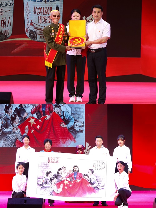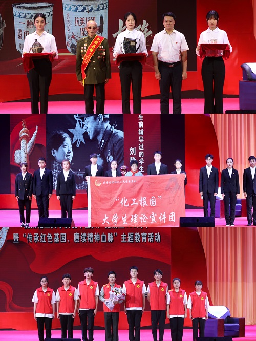 校大学生国旗护卫队代表为蒋庆泉献“致敬英雄”绶带;校“化工报国”大学生理论宣讲团代表接受刘静签名旗帜;校学雷锋志愿服务总队代表赠送吴锡有班长志愿服务红马甲,聘为志愿服务导师。我校教师代表演唱了《英雄赞歌》《再唱山歌给党听》《江山》等红色歌曲,并向三位英雄人物和先进模范敬献鲜花,表达对他们的深深敬意。