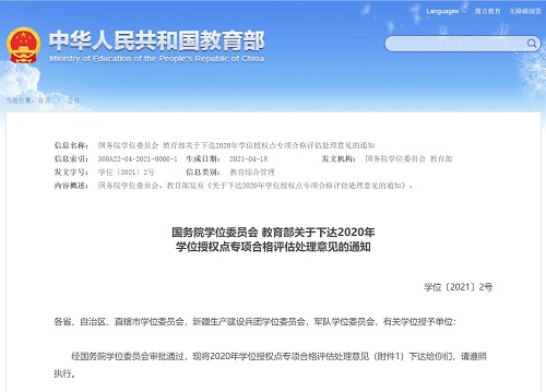 日前,国务院学位委员会、教育部发布《关于下达2020年学位授权点专项合格评估处理意见的通知》(学位〔2021〕2号),公布了2020年学位授权点专项合格评估处理意见以及学位授予单位主动提出放弃授权的学位授权点名单。全国共有345个学位授权点参评,处理意见为“继续授权”的学位授权点334个,处理意见为“限期整改” 的学位授权点5个,处理意见为“撤销授权”的学位授权点6个。beat365参评的外国语言文学一级学科和会计硕士专业学位类别顺利通过评估,学位点将继续授权。