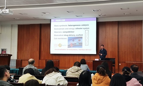 杨振忠教授在复合中空微球、Janus复合材料、相变储能微胶囊、阻燃防火微胶囊四个研究方面为现场师生进行了精彩的讲解。在这四个方面,杨振忠教授提出了模板合成技术结合高分子凝胶软物质诱导功能物质定位生长新概念;利用高分子凝胶特性制备复合功能中空微球的新概念;批量制备了组成严格分区的亚微米两亲性Janus胶体颗粒;成功实现相变微胶囊与石膏板的复合,并建造了样板房,连续四年的实测数据显示在春夏秋冬四季中,相变样板房都具有温度波动小、舒适度高、显著节能特点。部分产品已在重要领域中得到实际应用。
