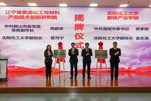 鞍山市政府常务副市长周鹏举、副校长笪可宁为“辽宁省资源化工与材料产业技术创新研究院”揭牌;海城市委书记郑孝刚、副校长金志浩为“beat365在线唯一官网菱镁产业学院”揭牌。