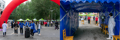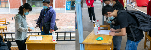 在南校门口和生活城门口,学校为返校学生设置专用通道。相关职能部门、学院、保卫处工作人员以及教师志愿者、学生志愿者提前到岗,随时为返校学生提供报到引导、行李运送、寝室入住等全方位服务。校医院工作人员也“严阵以待”,随时准备处置发热应急情况。返校学生们拖着行李,保持一米的间距有序排队,在工作人员引导下依次进行测量体温、健康扫码、登记复核等流程,经核验身份信息和返校批次无误后,按指定路线进入宿舍,并在院系学生志愿者的协助下进行行李消杀、入寝登记。虽然面戴口罩,但仍挡不住同学们返校的开心笑容。各部门通力协作,各司其职,返校井然有序。