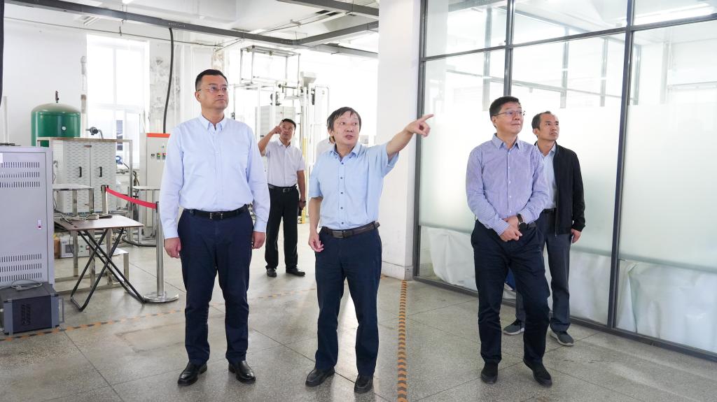在特色资源化工与材料教育部重点实验室,校长许光文详细介绍了实验室研究方向、团队情况、科研平台与项目、产业化成果以及近年取得的工作成绩,特别介绍了在“三定向”模式下实施的“40万吨菱镁矿闪速轻烧工程”“2万吨/年草酸酯项目”等重大应用工程。