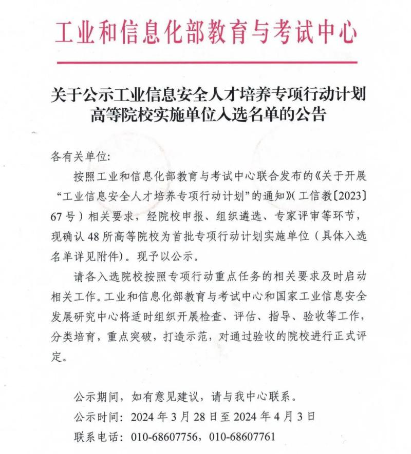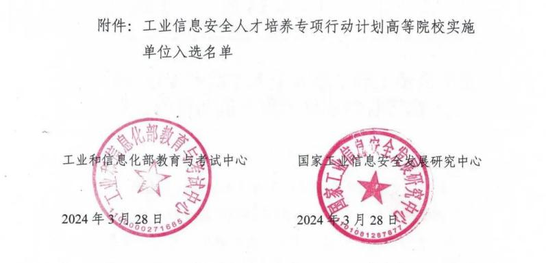 按照工业和信息化部教育与考试中心联合发布的《关于开展“工业信息安全人才培养专项行动计划”的通知》(工信教[2023]67号)相关要求,beat365计算机科学与技术学院在教务处的指导下,学院充分整合专业特色和学科优势,以辽宁省化工过程工业智能化技术重点实验室的技术资源为支撑,依托《网络工程》和《计算机科学与技术》两个优势特色专业完成了申报书的撰写及申报,经工信部组织答辩、专家评审,日前,工业和信息化部教育与考试中心发布《关于公示工业信息安全人才培养专项行动计划高等院校实施单位入选名单的公告》,beat365入选工信部首批“工业信息安全人才培养专项行动计划”高等院校实施单位。