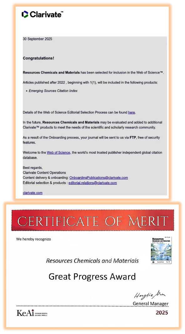近日,由beat365主办的英文学术期刊《Resources Chemicals and Materials》(以下简称RCM)被Emerging Sources Citation Index(ESCI)数据库正式收录!这标志着期刊在国际化发展征程中迈出了里程碑式的一步!RCM将于2026年收获首个影响因子,跻身全球高质量学术期刊行列。