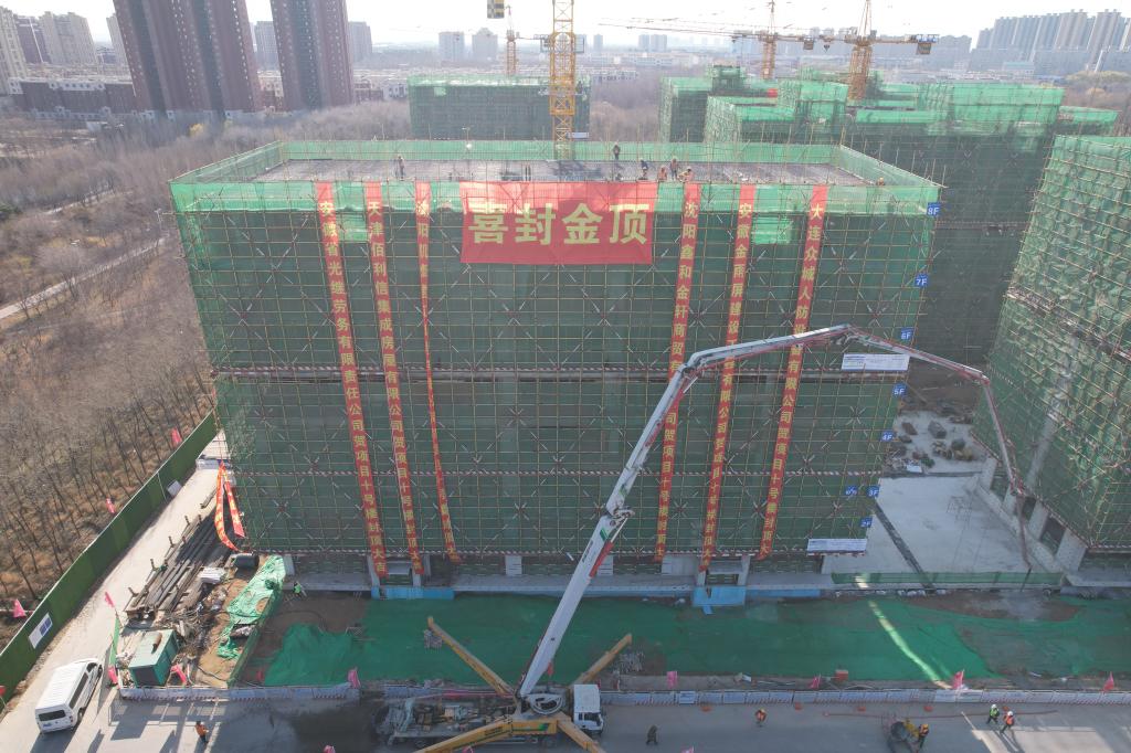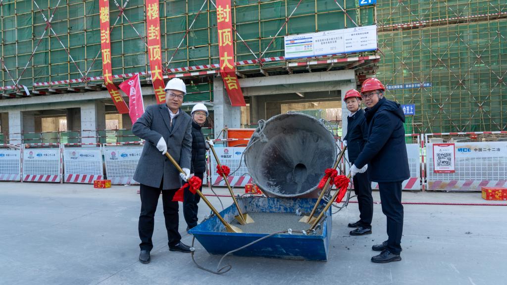 现场领导共同挥锹,完成最后一方混凝土吊装浇筑,宣告项目实现封顶目标。