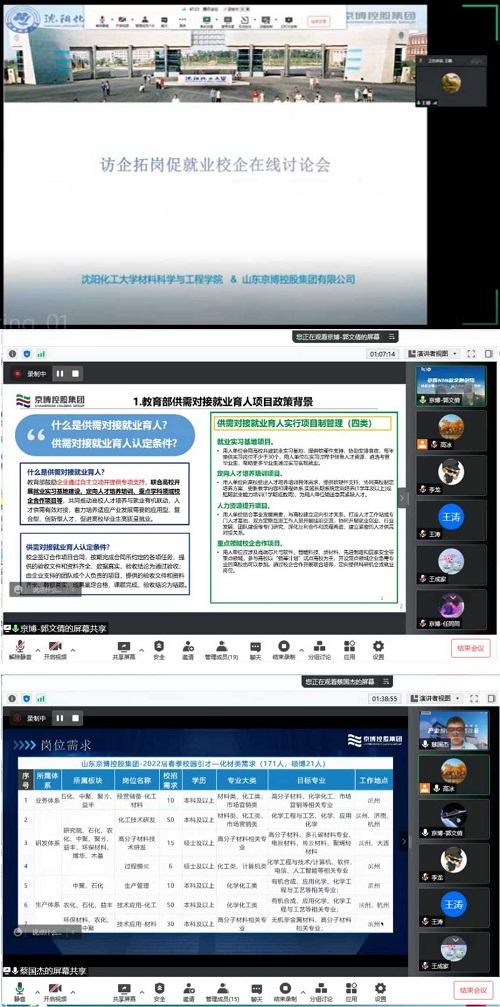 为了应对2022届高校毕业生严峻复杂的就业形势,促进毕业生更高质量就业,全面深化校企合作和人才供需对接,材料科学与工程学院率先开展了访企拓岗专项行动。4月28日上午,材料科学与工程学院与山东京博控股集团有限公司在线召开访企拓岗促就业校企讨论会。参会人员包括beat365在线唯一官网招生就业处处长王成家,材料科学与工程学院领导班子、学院各教研室主任和各年级辅导员,山东京博控股集团有限公司相关领导及部分在京博集团就业的校友。