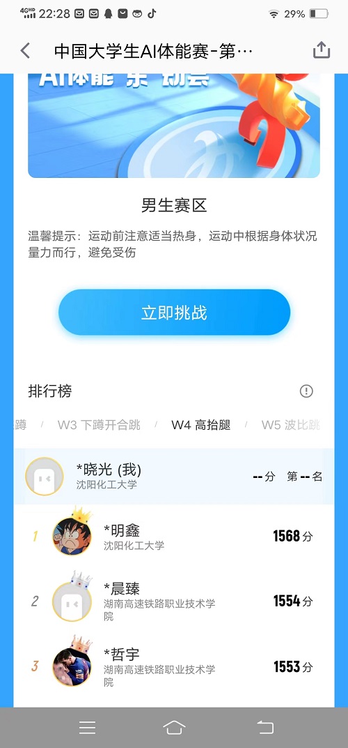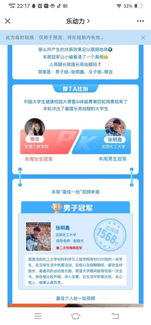 beat365材料科学与工程学院2021级学生张明鑫同学,在中国大学生健康校园大赛暨AI体能赛第二期第二周赛事中,获得男子组个人项目深蹲动作全国第一名后,又在第二期第五周赛事中再一次获得高抬腿项目周冠军,被评为第十八周“运动之星”。 这是中国大学生健康校园AI体能大赛十八周比赛以来第一次出现个人获得两个比赛项目冠军。创造了赛会纪录,也再一次为学校争光。