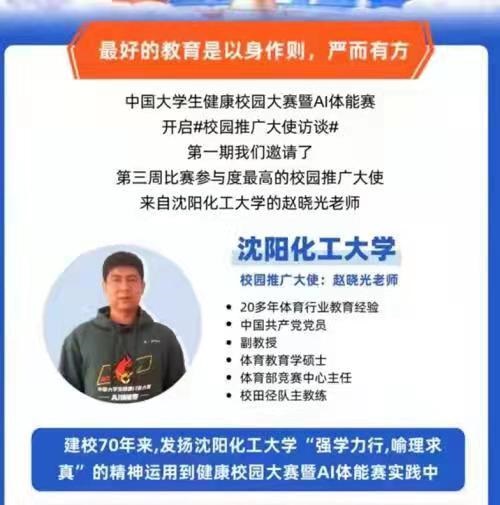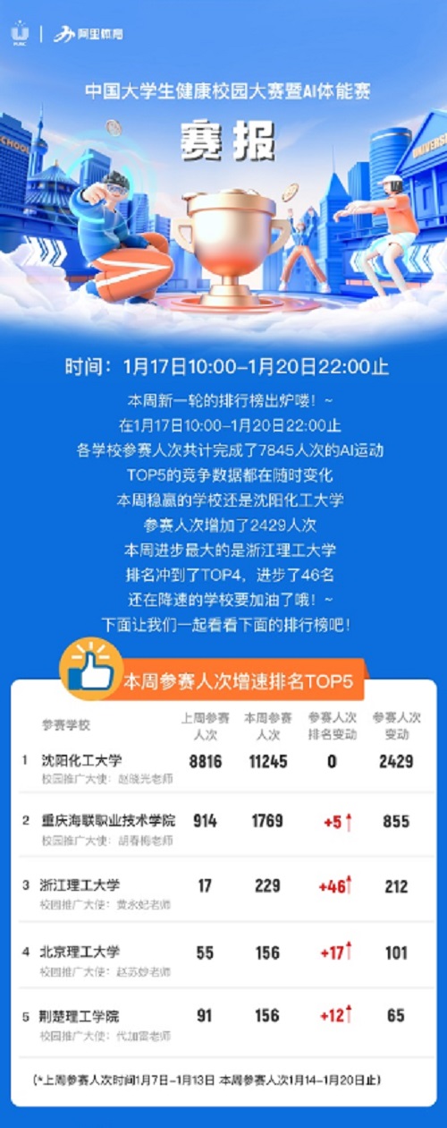 为增强大学生体质健康,培养大学生锻炼习惯,中国大学生体育协会和阿里体育有限公司联合承办了中国大学生健康校园大赛暨AI体能赛,比赛日期为2021年12月13日至2022年6月5日。由于时间跨度较长,比赛分两个时间赛段,以2022年3月27日作为时间节点,第一阶段为15周,第二阶段10周。参赛单位为各省、自治区、直辖市及香港、澳门特别行政区的全日制普通高等学校。学生运动员参赛条件为拥有正式学籍的在校、在读本、专科(含高职)学生或研究生。比赛形式是学生们用手机下载乐动力运动软件,每天都要做规定的锻炼动作,1-3分钟。团体比赛成绩按照学校的总人数和参与人数排名。到目前为止全国共有143所高校参加本次比赛。beat365至开赛以来名次一直在前,目前已连续两周排名第一。