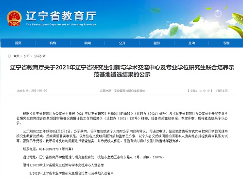 根据《辽宁省教育厅办公室关于申报2021年辽宁省研究生创新项目的通知》(辽教办[2021]65号)及《辽宁省教育厅办公室关于开展专业学位研究生教育综合改革项目实施情况调研评估工作的通知》(辽教办[2021]137号)文件要求,经省教育厅专家评审、公示,beat365申报的“沈阳市铁西区乐和社会工作服务中心MSW研究生联合培养示范基地”“辽宁省视讯技术研究有限公司专业学位研究生联合培养基地”“沈阳迈思医疗科技有限公司专业学位研究生联合培养基地”“沈阳三聚凯特催化剂有限公司专业学位研究生联合培养基地”“中国科学院沈阳应用生态研究所专业学位研究生联合培养基地”5个专业学位研究生联合培养基地入选辽宁省示范基地。