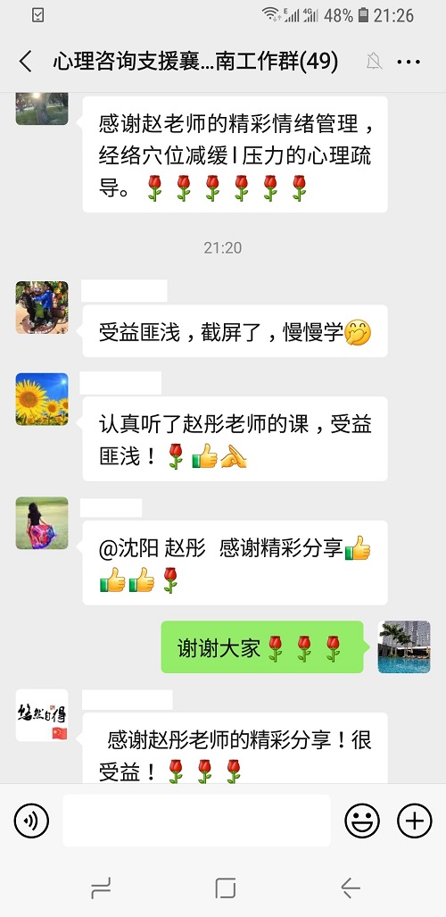 河南暴雨突发后,赵彤老师第一时间加入援豫志愿服务团队,并积极开展线上心理服务,帮助焦作市解放区人民法院员工等链接资源、做好情绪管理等服务工作。