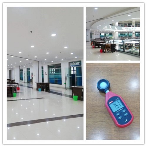 图书馆在暑假期间实施了灯光亮化工程,将馆内照明灯具统一升级改造。新更换的灯具不仅更为节能环保,同时照明亮度更高,夜晚灯光照射到阅览桌的照明照度(光通量)可达757 Lux(远高于阅读时所需之照明照度600Lux)。从根本上解决了因图书馆照明设施陈旧老化导致灯光昏暗的问题,为广大师生读者提供了更为明亮、舒适的学习环境。