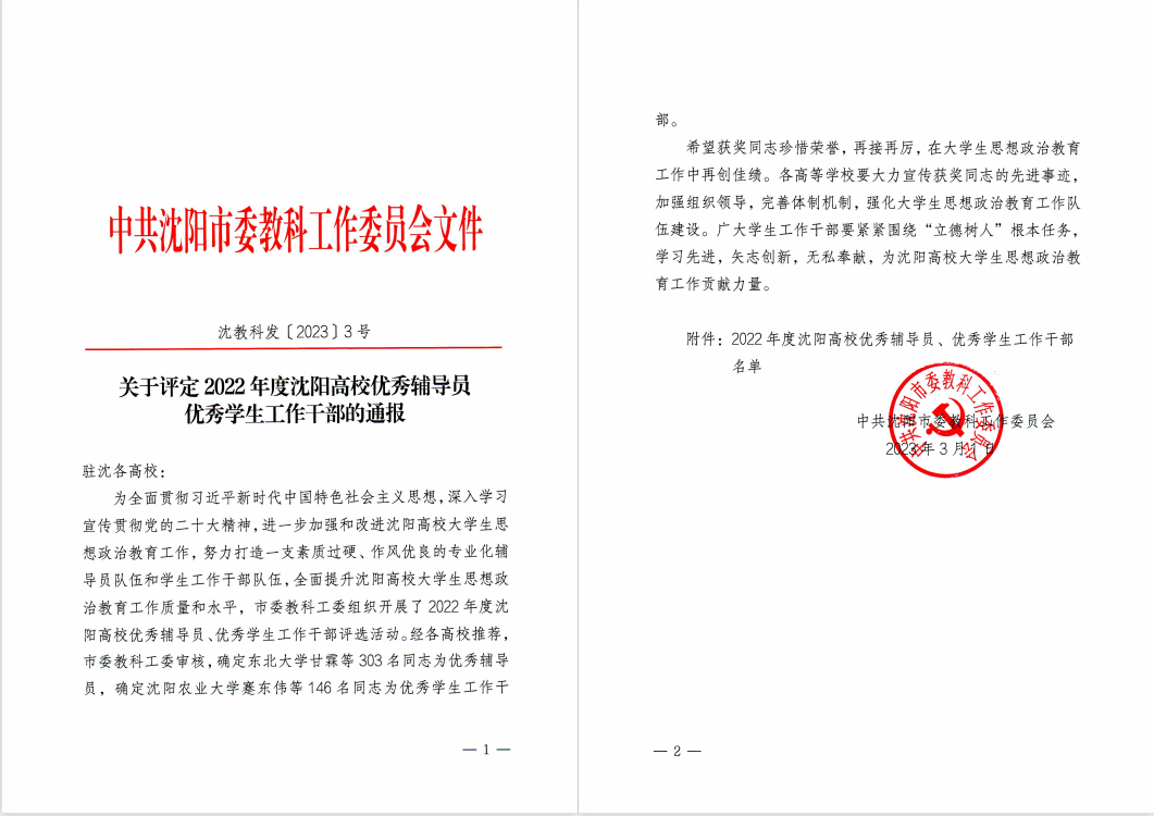 近日,由中共沈阳市委教科工作委员会组织开展的2022年度沈阳高校优秀辅导员和优秀学生工作干部评选活动结果揭晓,beat365信息工程学院杜明日、人文与艺术学院胡明辉、材料科学与工程学院焦韦、外国语学院金鑫、机械与动力工程学院李楷、经济与管理学院刘伟、化学工程学院王博、环境与安全工程学院吴化林、国际教育学院张舒怡、计算机科学与技术学院赵岳等十名辅导员荣获2022年度沈阳高校“优秀辅导员”荣誉称号;外国语学院安羽白、党委学生工作部李勃、应用技术学院李洪旭、环境与安全工程学院梁艳青荣获2022年度沈阳高校“优秀学生工作干部”荣誉称号。