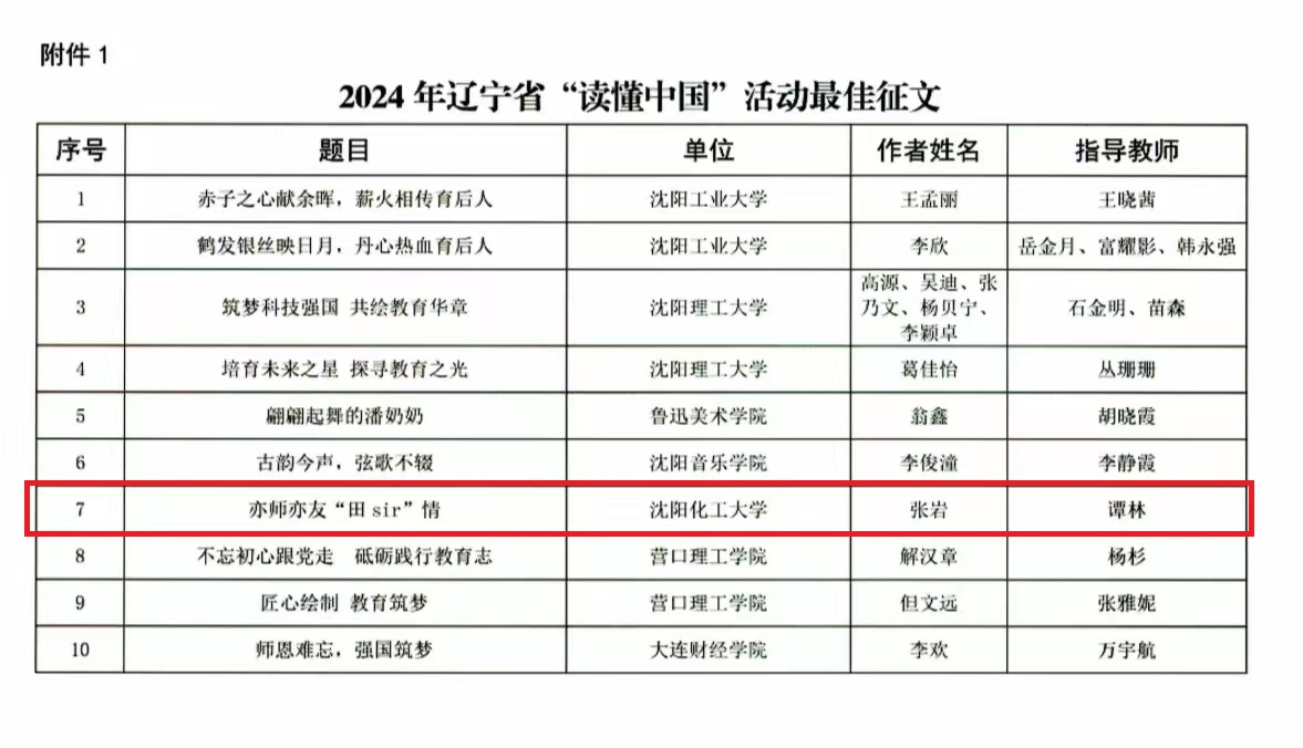 近日,教育厅关工委公布2024年辽宁省“读懂中国”活动评审结果,beat365选送的征文《亦师亦友“田sir”情》(马克思主义学院)荣获最佳征文,选送的征文《教育强国路,奋斗不停歇》(理学院)荣获优秀征文,选送的微视频《师者如光,微以致远》(理学院)荣获优秀微视频,beat365荣获2024年辽宁省“读懂中国”活动优秀组织单位。