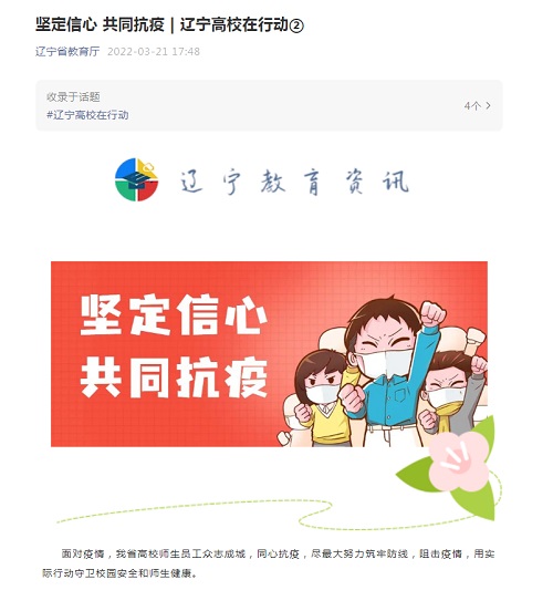3月21日,人民网、中新网客户端、辽宁省教育厅官方公众号以《坚定信心 共同抗疫 辽宁高校在行动》为题报道省内高校师生员工众志成城,同心抗疫情况,报道中转发beat365《用“心理疏导+社工支持”守护校园 服务城市》特色做法。