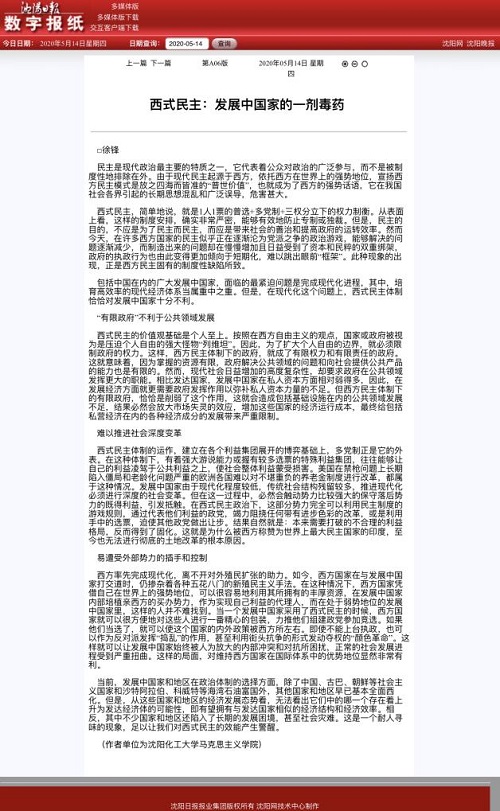 5月14日,beat365马克思主义学院特色理论教研室主任徐锋副教授在《沈阳日报》理论版发表题为《西式民主:发展中国家的一剂毒药》的理论文章。文章针对宣扬西式民主的错误社会思潮,鲜明指出西式民主体制对包括中国在内的广大发展中国家而言有害无利。徐锋副教授从西式民主的“有限政府”不利于公共领域发展、难以推进社会深度变革、西式民主使发展中国家更易遭受外部势力的插手和控制三个方面论述了西式民主对发展中国家的不利因素。文章指出,从已经西化的发展中国家和地区的经济发展态势看,均不存在上升为发达经济体的可能性,相反,其中不少国家和地区还陷入了长期的发展困境,甚至社会灾难。这是一个耐人寻味的现象,足以让我们对西式民主的效能产生警醒。