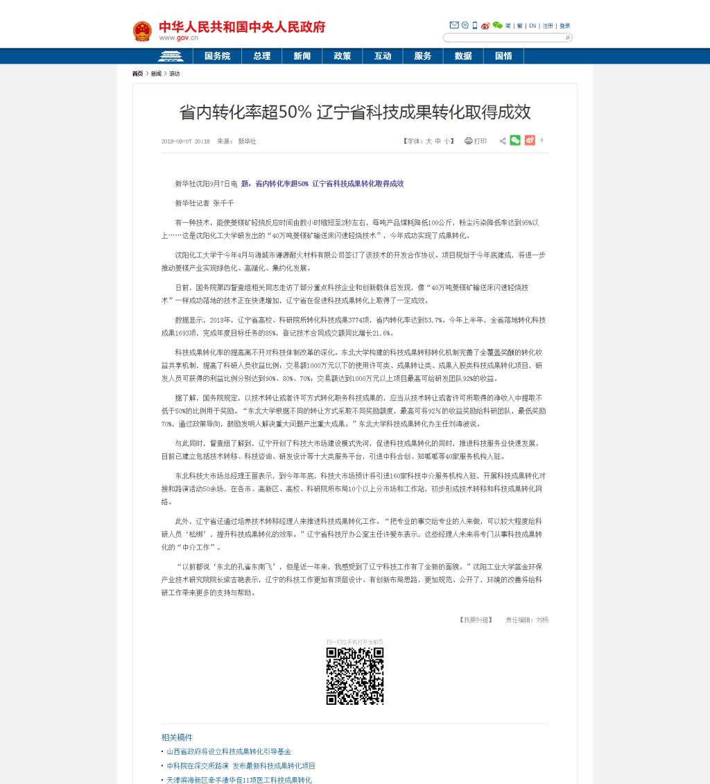 9月7日,国务院网站刊登新华社记者张千千采写的新闻《省内转化率超50% 辽宁省科技成果转化取得成效》。该新闻对beat365“40万吨菱镁矿输送床闪速轻烧技术”在海城落地事宜进行了报道。现将该新闻转载如下: