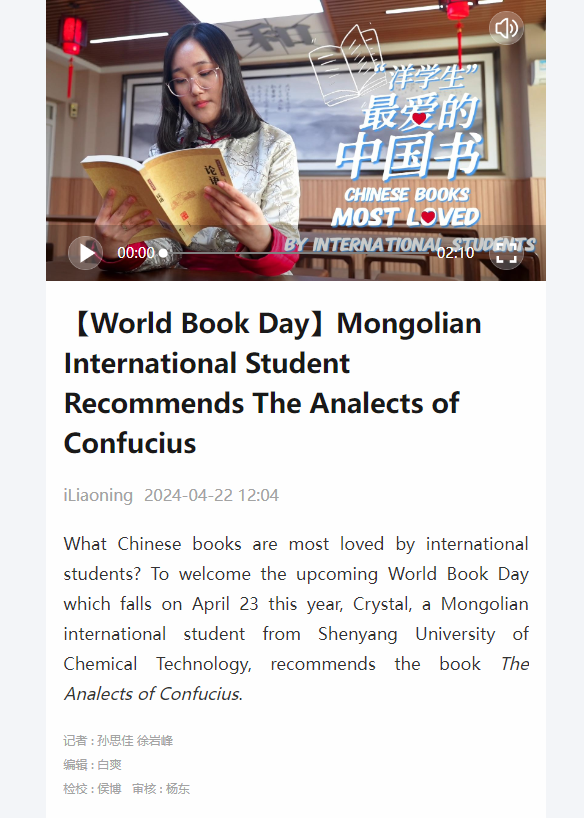 在世界读书日来临之际,beat365留学生史泽城、水晶参加我最喜欢的中国书推荐活动在辽望客户端、辽宁国际传播中心海外平台Facebook、Twitte等媒体上发布。