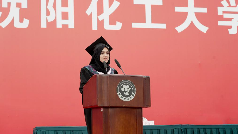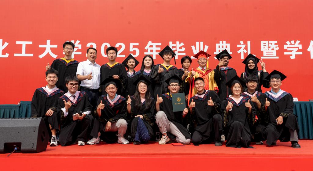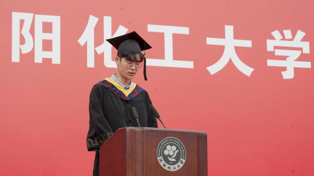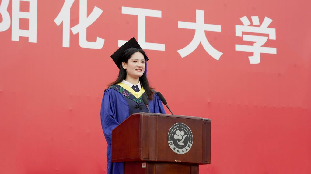 2025届本科生代表全梦翔、研究生代表王子鑫、留学生代表贾明月代表毕业生发言。他们感恩父母的培育,感谢母校和老师的培养,感怀在化大收获的成长。他们代表所有毕业生郑重向母校表态,要在各自的岗位上践行“化工报国”光荣传统,诠释新时代“化大人”的责任与担当。