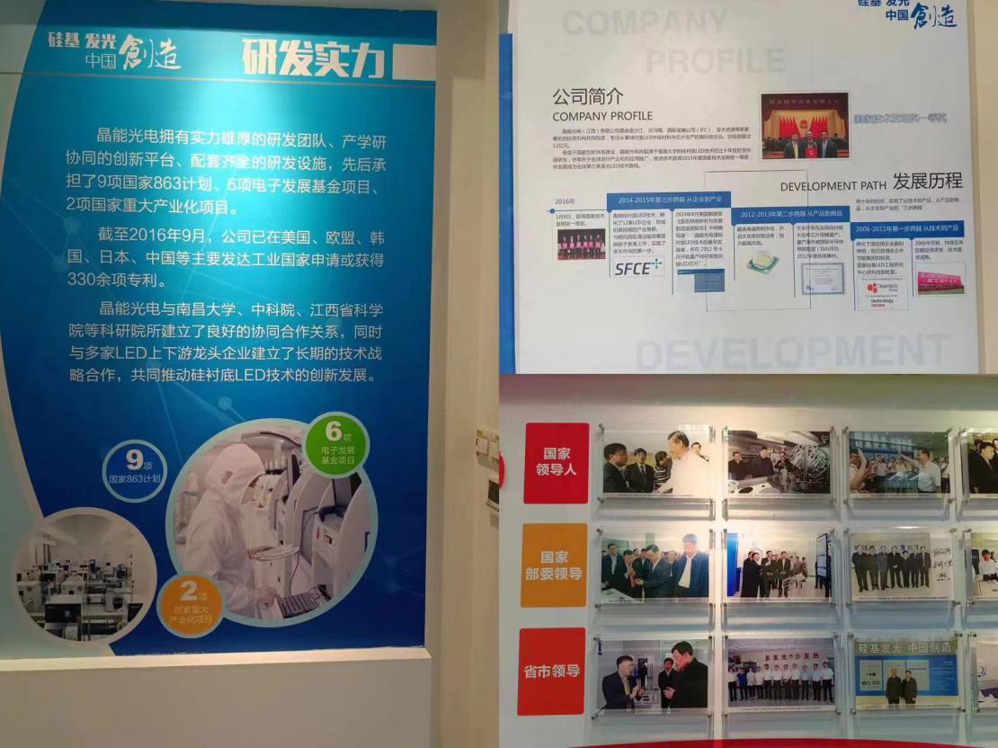 在企业负责人的陪同下,阎峰院长一行到企业中进行参观,晶能光电拥有实力雄厚的研发团队,曾先后承担国家863计划(国家重点研发计划)、电子发展基金项目等9项,省级研发及产业化项目60余项,在全球范围内已申请或拥有480余项专利,自主创新的硅衬底LED技术荣获2015年度国家技术发明一等奖。